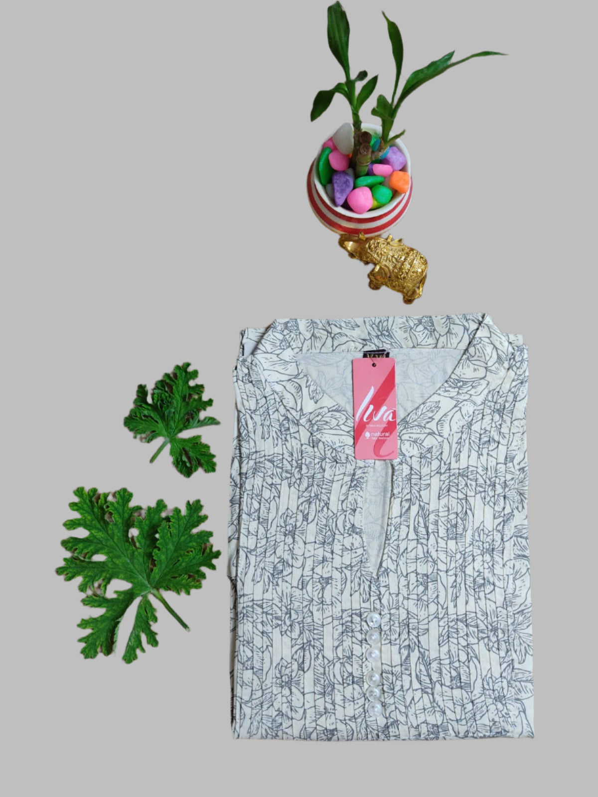 Off-White Soft-Cotton Green Floral Long Kurti Top