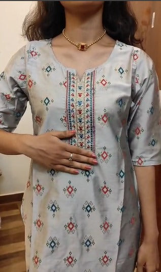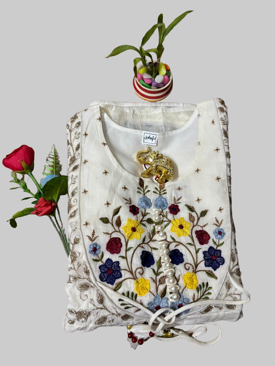 Off-White Heavy Embroidery Long Cotton Kurti Top