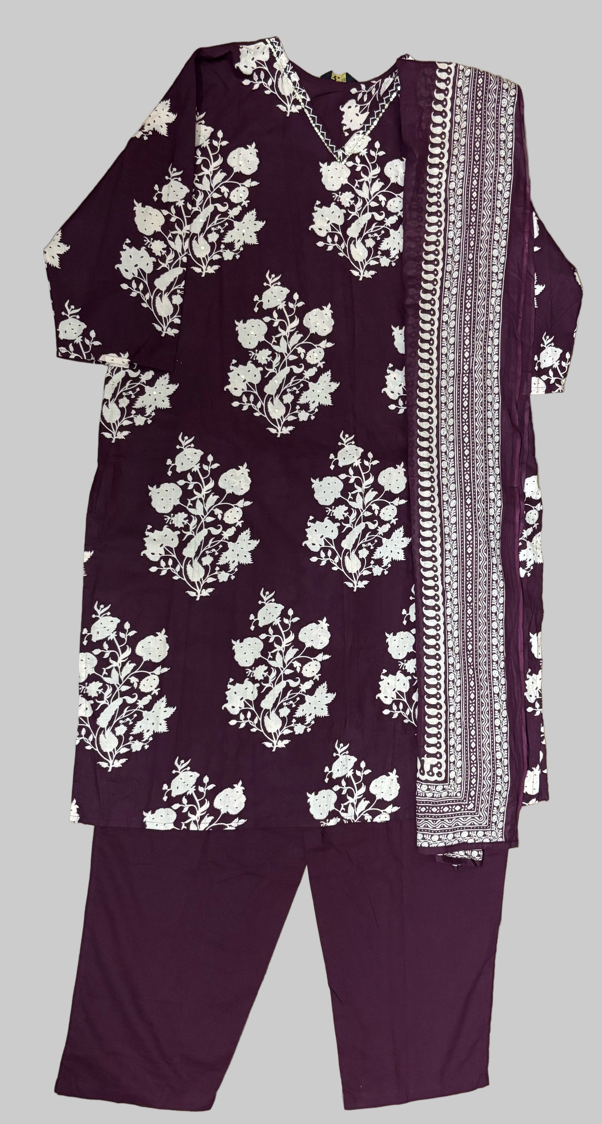 Elevate your ethnic wardrobe with this sophisticated maroon cotton three-piece kurti set. Crafted from breathable, premium cotton fabric, this ensemble combines comfort with timeless style. The set includes a beautifully designed kurti paired with coordinating pieces, perfect for casual gatherings, festive occasions, or everyday wear. The rich maroon hue complements all skin tones while maintaining an understated elegance. Ideal for those seeking quality traditional wear that doesn't compromise on comfort or durability.