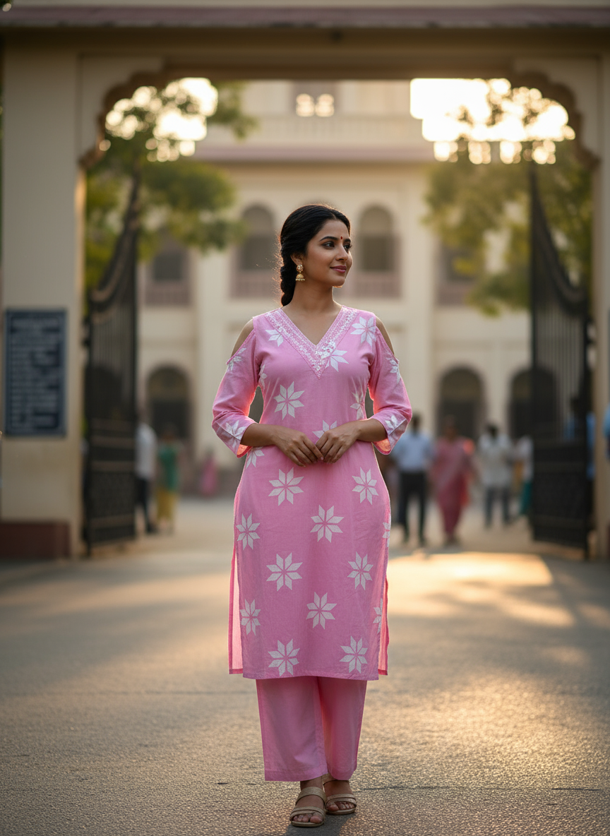 Elevate your everyday wardrobe with this sophisticated pink cotton two-piece kurti set. Crafted from breathable, premium cotton fabric, this ensemble combines comfort with timeless style. The set features a well-tailored kurti paired with coordinating bottoms, offering versatility for casual outings, work, or festive occasions. The soft pink hue complements all skin tones while maintaining an understated elegance. Perfect for those seeking quality ethnic wear that transitions seamlessly from day to evening, this set delivers both durability and refined aesthetics.
